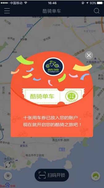 酷骑:点进app之后,下方就有扫码开锁,一扫就开,如果扫不上的话也可以手动输入。骑行结束后,手动锁车后自动结束行程并计费。